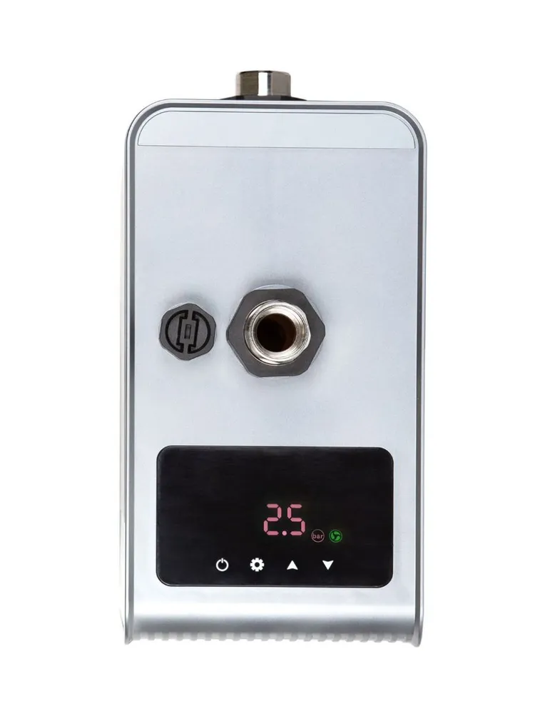 Установка отличается малым уровнем шума, компактными размерами и надежной конструкцией. Оснащена датчиком, который постоянно измеряет давление на выходе.